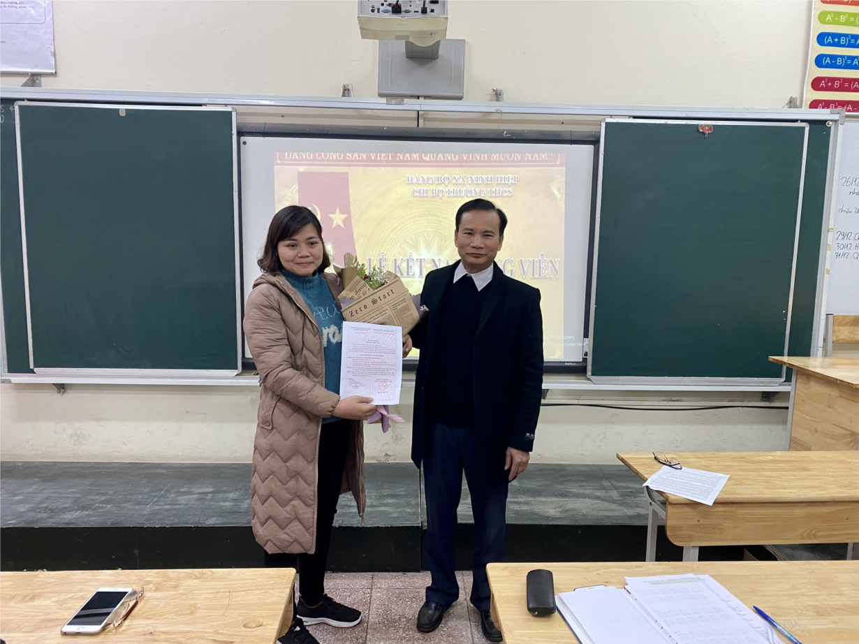 Ngày 29/12/2022, Chi bộ Trường THCS Ninh Hiệp đã tiến hành Lễ kết nạp đảng viên mới cho quần chúng ưu tú là đồng chí Nguyễn Thị Phượng ( tổ KHTN ).