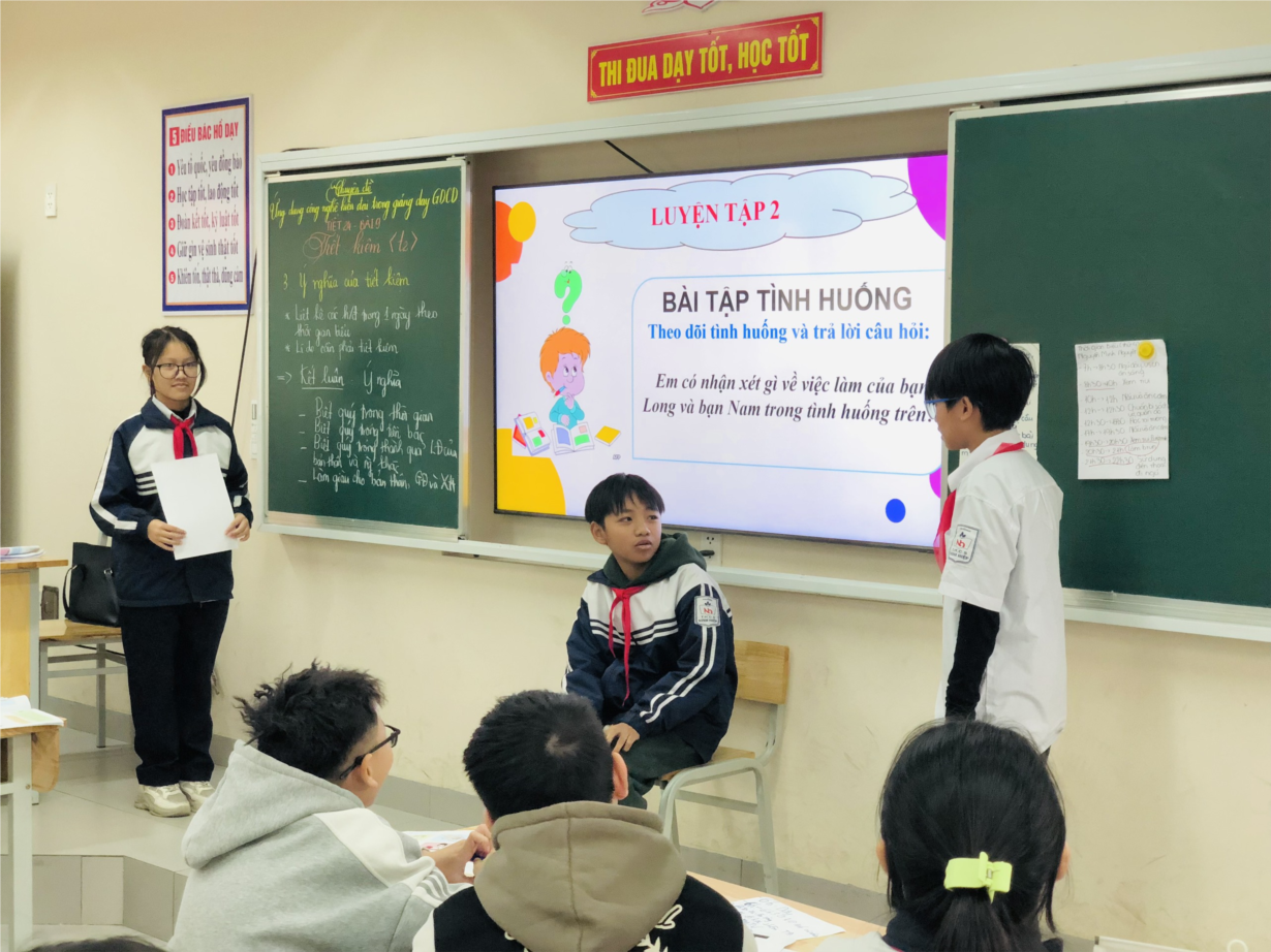 Giáo viên đã chuẩn bị bài học rất kĩ lưỡng, thiết kế tình huống học tập, lồng ghép nội dung một cách phù hợp để học sinh vận dụng các tri thức và các kĩ năng vào giải quyết các tình huống thực tiễn đặt ra. Tiết học được thực hiện đã phát huy những ưu thế của công nghệ thông tin trong giai đoạn dạy học hiện nay bằng các phần mềm như Padlet, Quiz… Bên cạnh đó, giáo viên đã áp dụng nhiều phương pháp dạy học tích cực, học sinh có cơ hội được trau dồi năng lực tự học khi được chuẩn bị nhiệm vụ trước tiết học - tìm hiểu về ý nghĩa của việc tiết kiệm, xây dựng thời gian biểu hợp lí trong ngày, phân bổ cho các hoạt động học tập, lao động, giải trí, các tình huống, tiểu phẩm về tiết kiệm…. Các em chủ động, hăng hái, tràn đầy tự tin báo cáo sản phẩm và đưa ra những nhận xét xác đáng, mang tính xây dựng cho các bạn khác.
