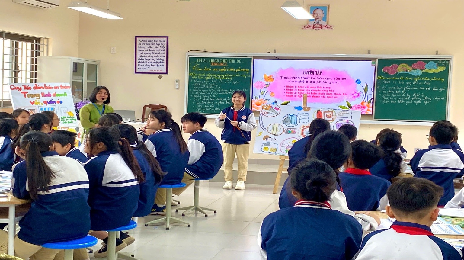 Tiết học diễn ra sôi nổi với sự tham gia nhiệt tình của các em học sinh. Cô giáo Hồ Thị Hải Hà đã khéo léo vận dụng nhiều phương pháp dạy học hiện đại như thuyết trình, làm video, đóng kịch, giúp bài giảng trở nên phong phú, trực quan và hấp dẫn. Qua đó, học sinh không chỉ nắm được kiến thức về các nghề nghiệp địa phương mà còn rèn luyện kỹ năng giao tiếp, làm việc nhóm và sáng tạo.