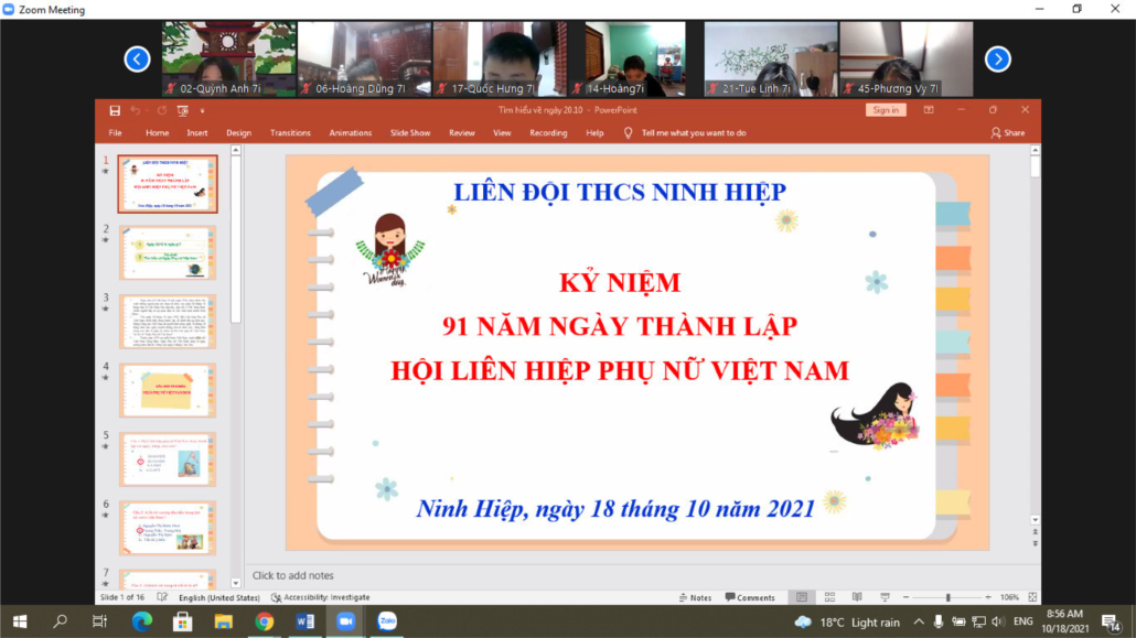 Nhân ngày có ý nghĩa lịch sử trọng đại này, sáng nay, ngày 18 tháng 10 năm 2021, trong giờ chào cờ, sinh hoạt lớp, đồng loạt các chi đội trong liên đội đã tổ chức kỷ niệm 91 năm Ngày thành lập Hội Liên hiệp Phụ nữ Việt Nam. Thông qua các hoạt động, các em học sinh của nhà trường xin gửi đến các cô, các chị, các mẹ và toàn thể các bạn nữ những lời chúc tốt đẹp nhất. Chúc các cô, các chị các mẹ luôn là chỗ dựa và niềm tin vững chắc cho chúng ta vững bước trên cuộc đời. Chúc các bạn nữ luôn xứng đáng là con ngoan, trò giỏi, là những người phụ nữ thành đạt, giỏi giang trong tương lai!